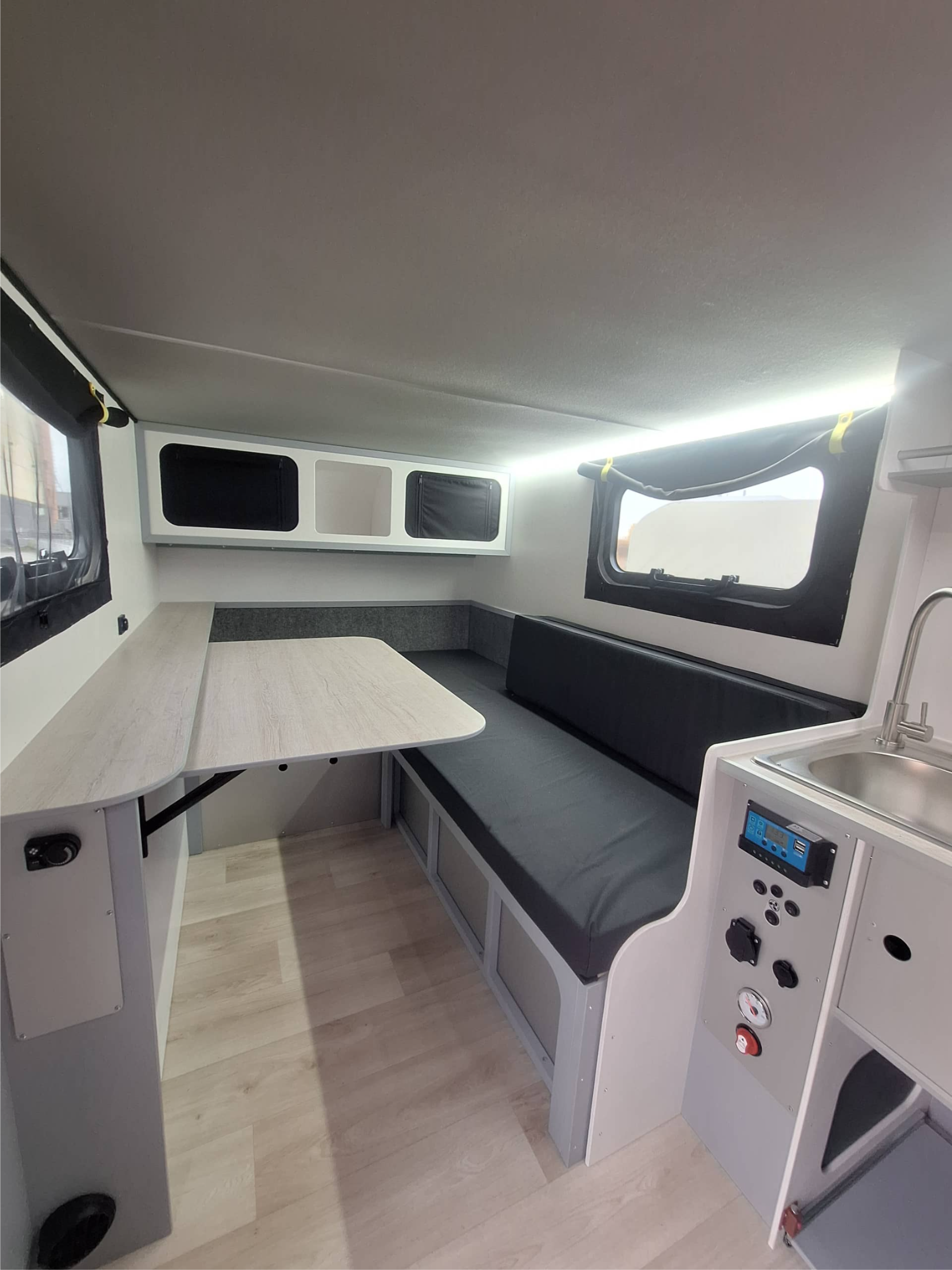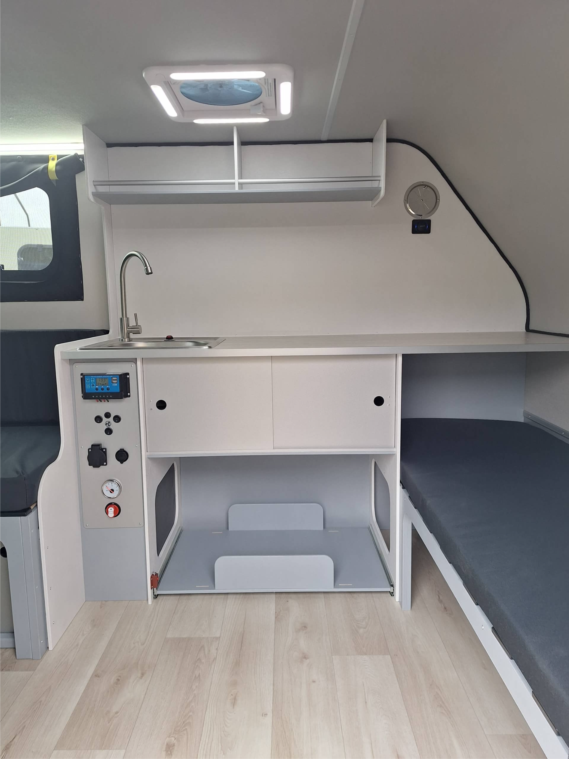 Кухонный отсек со стеллажом, раковина с краном (только холодная вода) бак 50л чистая вода и 10л серая вода, уровень воды в баке (чистая вода), свет в крышке кухни, розетки 12В, 220В.