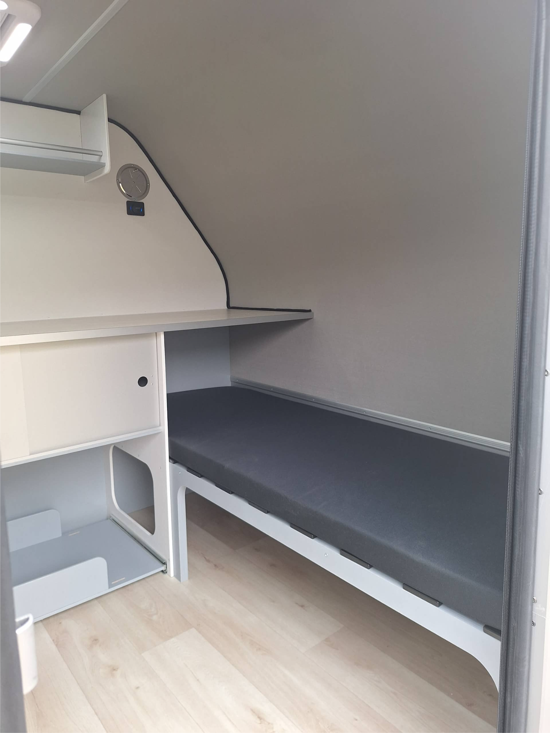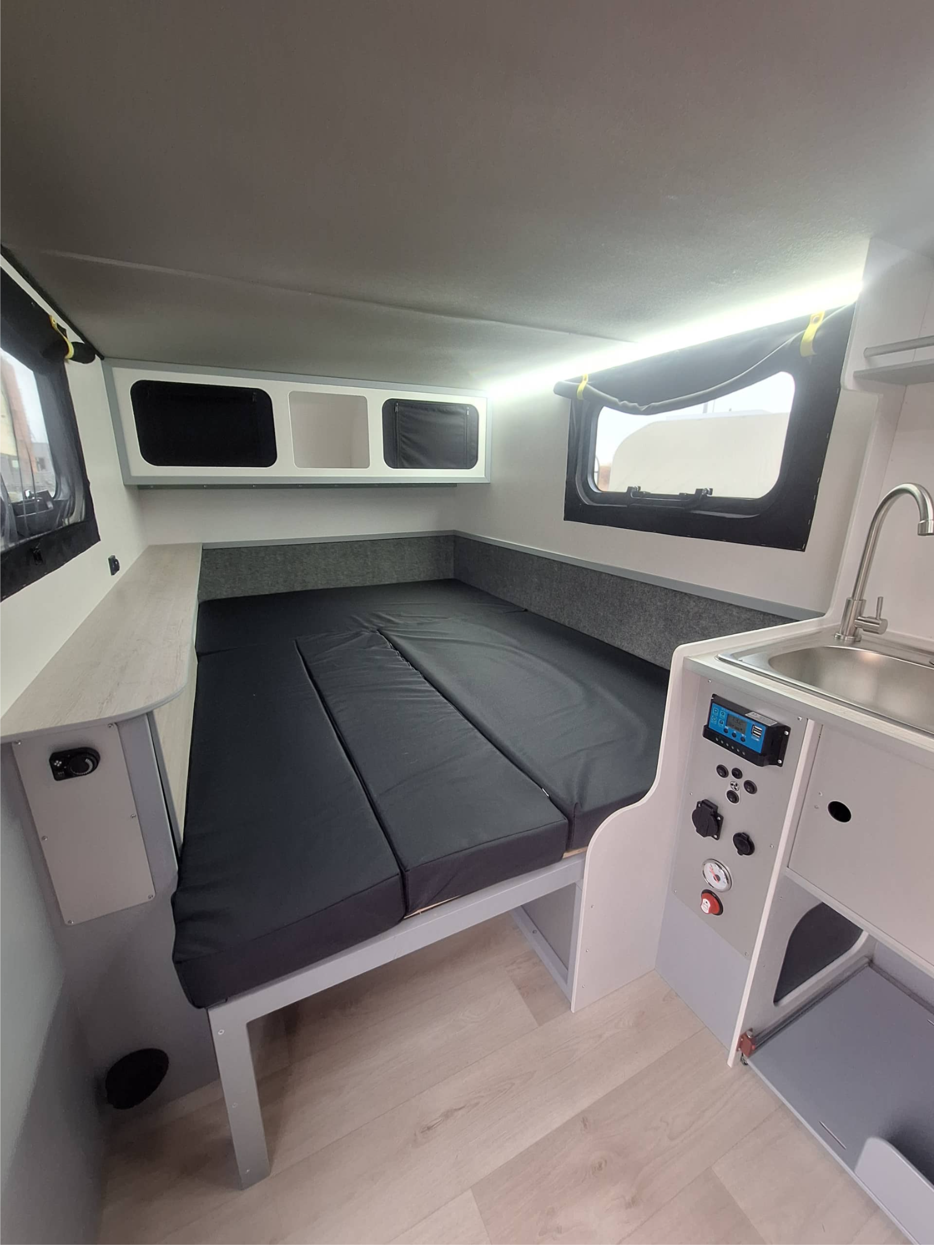 Салонные ящики под потолком, матрас, свет, розетка 12В, 220В, принудительная вентиляция в ногах, полка у изголовья с ящиками и с 2 USB розетками (Велес Мини полка отсутствует), москитные сетки на проемы дверей, шторы на проемы дверей,